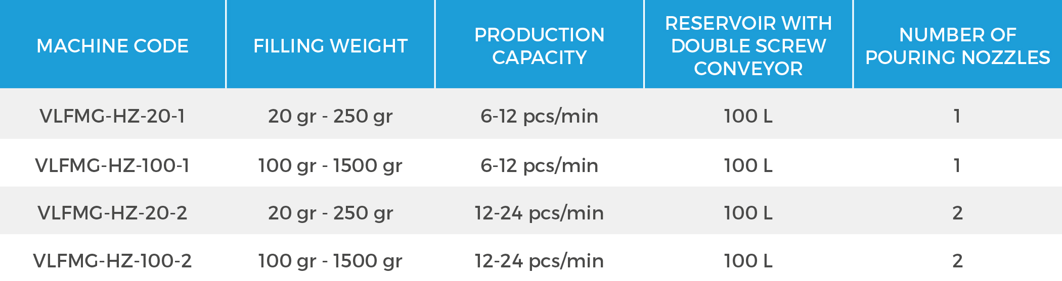 The filling machine is adapted to pour the product from 20 to 1500 g into containers.